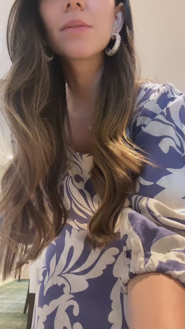 Un vestido entre tonos blanco y azul lila. Este diseño emana una sensación de frescura y elegancia casual. Las mangas añaden un toque romántico al look. Su corte tiene un sutil escote en cintura siendo muy cómodo.