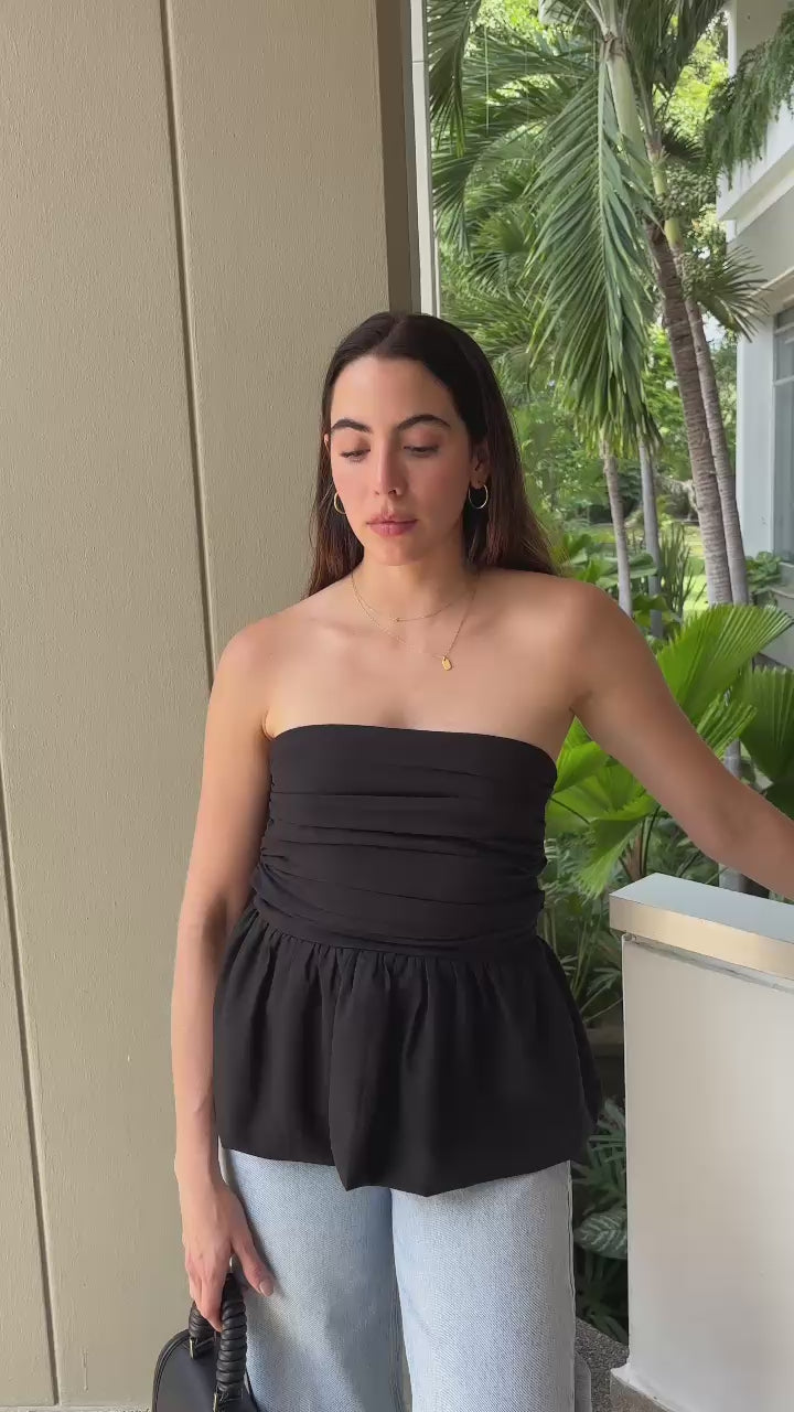 Una prenda esencial con carácter. Esta blusa strapless negra combina un fruncido sutil en el torso con un delicado vuelo en la parte baja, creando una silueta sofisticada y femenina. Su diseño limpio la convierte en un fondo de armario versátil, ideal tanto para looks relajados como más pulidos.
